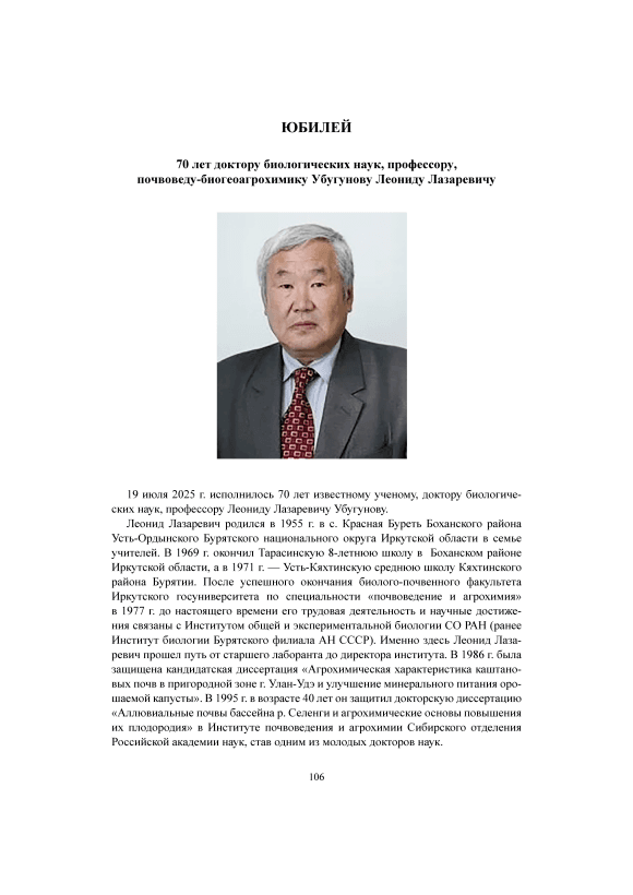 70 лет доктору биологических наук, профессору, почвоведу-биогеоагрохимику Убугунову Леониду Лазаревичу