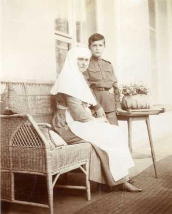 Императрица Александра Федоровна и цесаревич Алексей возле здания дворцового лазарета в Царском Селе, 1914 г.