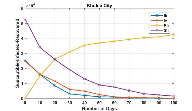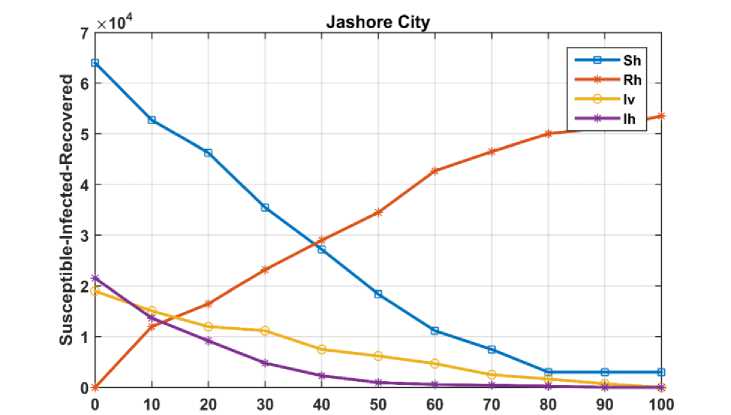 The graph illustrates that a significant portion of the population recovers over time, with time measured in days. The simulation indicates that the number of infected humans approaches zero after approximately 85 days, while the infected housefly population reaches zero after about 100 days. Notably, since there are no remaining infected houseflies, some exposed individuals remain uninfected beyond day 100. Consequently, the numbers of susceptible and recovered individuals stabilize after this period, consistent with expected epidemiological behavior. Furthermore, the results suggest that highly infected houseflies die at a faster rate than those with lower infection levels, highlighting the impact of infection intensity on vector mortality.