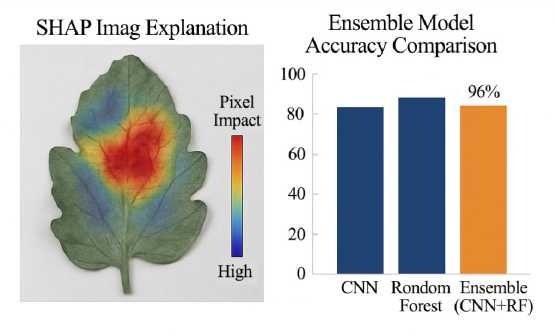 The experimental results demonstrate the effectiveness of the proposed hybrid model in classifying tomato leaf diseases. Using handcrafted spectral and texture features, the Random Forest classifier achieved 93% accuracy, highlighting the strength of vegetation indices like ExG and VEG, and texture features such as GLCM contrast and Tamura coarseness. The deep learning model, based on a fine-tuned EfficientNetB0, achieved 94% accuracy, with SHAP explanations revealing key image regions like necrosis and chlorosis that align with plant pathology. Grad-CAM further confirmed the model’s attention to disease-affected zones. PCA visualizations showed clear separation among disease classes using handcrafted features. Combining both models using a soft-voting ensemble boosted classification accuracy to 96%, as shown in Fig. 3. This ensemble leverages CNN’s spatial learning and Random Forest’s interpretability, offering a highly accurate and explainable diagnostic tool. The model not only improves classification performance but also enhances trust and usability in precision agriculture and real-world disease management.