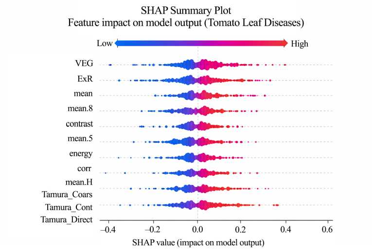 Обсуждение и заключение. Предложенная гибридная структура эффективно сочетает в себе характеристики, обусловленные предметной областью и представлениями глубокого обучения, обеспечивая высокую точность диагностики и прозрачное принятие решений. Визуальные пояснения и пояснения на уровне признаков подтверждают, что биологически значимые области, такие как некротические и обесцвеченные участки, определяют прогнозное моделирование. Этот подход обеспечивает масштабируемое и надежное решение для автоматизированной диагностики заболеваний томатов, подходящее для практического применения в системах интеллектуального и точного земледелия.