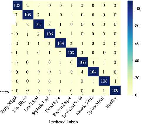 F i g. 6. Confusion matrix heatmap showing the performance of the CNN–RF ensemble model for ten tomato leaf disease classes