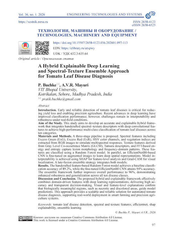 Введение. Для точного земледелия решающее значение в снижении потерь урожая имеет ранняя и точная диагностика болезней листьев томата. Недавние достижения в области глубокого обучения улучшили эффективность диагностики болезней. Однако в реальных полевых условиях остаются нерешенными проблемы надежности интерпретируемости эксплуатационных показателей. Цель исследования. Получение высокоэффективной классификации заболеваний листьев томатов по десяти категориям с помощью обученной нейронной сети на основе сочетания точной и понятной гибридной структуры, разработанной специалистами по анализу данных со сверхточными спектральными и текстурными элементами. Материалы и методы. Предложен трехэтапный конвейер. Спектральные признаки, такие как избыток зеленого (ExG), избыток красного (ExR), цветовые каналы HSV и вегетативные индексы, получили из RGB-изображений для моделирования многоспектральных реакций. Текстурные признаки, полученные из матрицы смежности уровней серого (GLCM), дескрипторов Тамура и энергии и энтропии на основе быстрого преобразования Фурье (FFT), позволяют выявить структуру повреждений и частотные характеристики. Эти показатели классифицируются с использованием метода «случайного поиска». Параллельно используется, сверхточная нейронная сеть на основе EfficientNetB0, обученная на дополненных изображениях для изучения глубоких пространственных представлений. Данные интерпретируются с помощью нейронных сетей SHAP для анализа признаков при выявлении болезней и Grad-CAM для визуальной локализации. Стратегия ансамблевого обучения с поздним слиянием данных объединяет обе модели. Результаты исследования. Модель «случайного поиска», разработанная специалистами по анализу данных, достигает базовой точности диагностики 89,2 %, в то время как сверхточная нейронная сеть EfficientNetB0 достигает точности 94 %. Ансамблевая структура дополнительно улучшает показатель диагностики до 96 %, демонстрируя повышенную устойчивость и обобщающую способность по всем десяти классам заболеваний. Обсуждение и заключение. Предложенная гибридная структура эффективно сочетает в себе характеристики, обусловленные предметной областью и представлениями глубокого обучения, обеспечивая высокую точность диагностики и прозрачное принятие решений. Визуальные пояснения и пояснения на уровне признаков подтверждают, что биологически значимые области, такие как некротические и обесцвеченные участки, определяют прогнозное моделирование. Этот подход обеспечивает масштабируемое и надежное решение для автоматизированной диагностики заболеваний томатов, подходящее для практического применения в системах интеллектуального и точного земледелия.