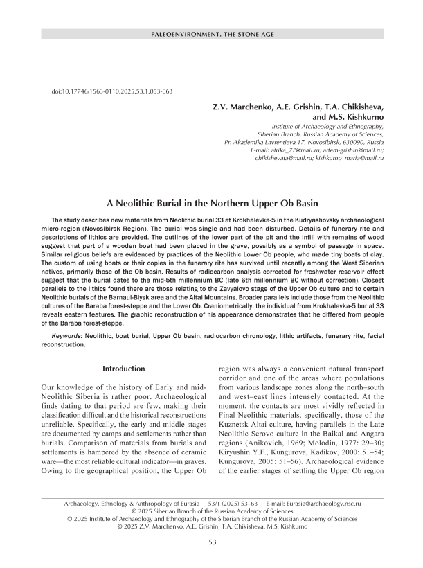 The study describes new materials from Neolithic burial 33 at Krokhalevka-5 in the Kudryashovsky archaeological micro-region (Novosibirsk Region). The burial was single and had been disturbed. Details of funerary rite and descriptions of lithics are provided. The outlines of the lower part of the pit and the infill with remains of wood suggest that part of a wooden boat had been placed in the grave, possibly as a symbol of passage in space. Similar religious beliefs are evidenced by practices of the Neolithic Lower Ob people, who made tiny boats of clay. The custom of using boats or their copies in the funerary rite has survived until recently among the West Siberian natives, primarily those of the Ob basin. Results of radiocarbon analysis corrected for freshwater reservoir effect suggest that the burial dates to the mid-5th millennium BC (late 6th millennium BC without correction). Closest parallels to the lithics found there are those relating to the Zavyalovo stage of the Upper Ob culture and to certain Neolithic burials of the Barnaul-Biysk area and the Altai Mountains. Broader parallels include those from the Neolithic cultures of the Baraba forest-steppe and the Lower Ob. Craniometrically, the individual from Krokhalevka-5 burial 33 reveals eastern features. The graphic reconstruction of his appearance demonstrates that he differed from people of the Baraba forest-steppe.