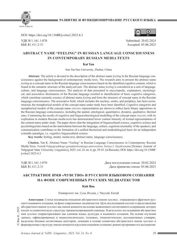 Статья посвящена описанию абстрактного имени чувство, отражающего фрагмент русского языкового сознания, на фоне современных медиатекстов. Цель исследования состоит в представлении абстрактного имени чувство как имени концепта на основе выявленного когнитивного содержания, которое входит в семантическую структуру проанализированной единицы. В результате исследования абстрактное имя чувство охарактеризовано как единица языка, культуры и языкового сознания. На основе изучения данных, зафиксированных в энциклопедических, толковых, этимологических, ассоциативных словарях, выделены базовые когнитивные категории, лежащие в основе семантики абстрактного имени чувство и формирующие структуру имени-концепта в русском языковом сознании, реконструировано его ассоциативное поле, включающее ядро, центр и периферию, установлены метафорические модели рассматриваемого имени-концепта. Определено, что когнитивные категории и метафорические модели представления имени-концепта чувство отражают базовые бинарные оппозиции русского языкового сознания: пространственные, онтологические, количественные, динамические, качественные, термические. Сопоставление результатов когнитивно-лингвокультурологического моделирования имени-концепта чувство с его экспликацией в современных русских медиатекстах продемонстрировало меньшую содержательную насыщенность текстовых репрезентаций описываемого имени-концепта. В статье показано, что интеграция лингвокультурологии, когнитивистики и психолингвистики на основе взаимосвязи языка, культуры, познания (ментальности человека говорящего) и коммуникации способствует формированию единой теоретико-методологической основы самостоятельной научной парадигмы – когнитивной лингвокультурологии.