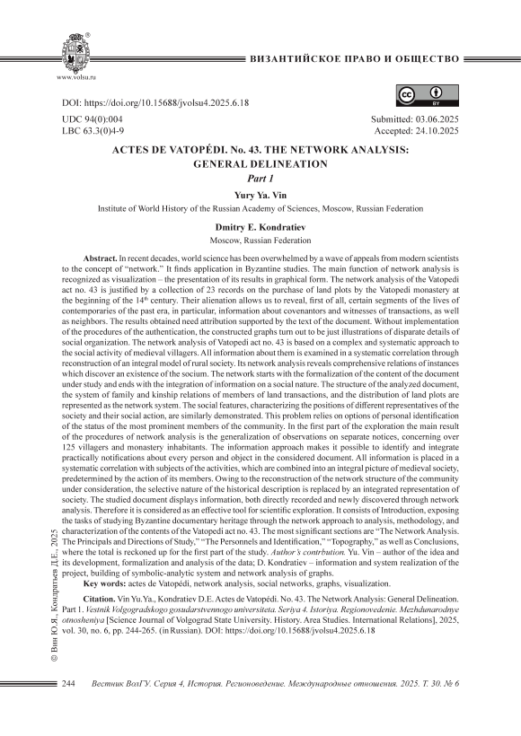 В последние десятилетия мировую науку захлестнула волна, поднятая обращением современных ученых к понятию «сеть» (network). Сетевой анализ приобретает все большее распространение, находя приложение в византинистике. Главной функцией сетевого анализа признана визуализация – представление его результатов в графической форме. Сетевой анализ ватопедского акта № 43 оправдан собранием 23 записей о скупке в начала XIV в. афонским монастырем земельных участков. Их отчуждение позволяет раскрыть в первую очередь определенные сегменты жизни современников эпохи прошлого, в частности, сведения о контрагентах и свидетелях сделок, а также соседях. Полученные результаты нуждаются в атрибуции и удостоверении, подкрепляемом содержанием текста источника. Без проведения соответствующих процедур построенные графы оказываются всего лишь иллюстрациями разрозненных деталей общественного устройства. Сетевой анализ ватопедского акта № 43 опирается на комплексный и системный подход к общественной активности средневековых селян. Вся информация о них анализируется в системной корреляции, посредством реконструкции интегральной модели сельского сообщества. Его сетевой анализ раскрывает всеобъемлющую связанность отдельных аспектов существования социума. Сетевой анализ начинается с формализации содержания изучаемого документа и завершается интеграцией сведений социального характера. Структура документа, система семейно-родственных отношений участников заключенных поземельных сделок и дистрибуция земельных наделов представлены как сетевая система. Также раскрыты социальные признаки, характеризующие общественное положение различных представителей социума и их социальной активности. Она опирается на возможности персональной идентификации статуса наиболее видных членов сообщества. В первой части исследования главным результатом проведенных процедур сетевого анализа является обобщение наблюдений над разрозненными сведениями, касающимися свыше 125 селян и монастырских насельников. Информационный подход позволяет выявить и интегрировать сведения практически о каждом человеке и объекте в рассматриваемом документе. Все полученные сведения поставлены в системное соотнесение между собой и соединены в интегральную картину средневекового социума, предопределенную деятельностью его членов. Благодаря реконструкции сетевой структуры изучаемого сообщества выборочный характер исторического описания замещает интегрированная репрезентация социума. Она отображает документальные сведения, как непосредственно зафиксированные, так и вновь выявленные посредством сетевого анализа содержания. Поэтому он рассматривается как эффективный инструментарий научного исследования. Оно состоит из «Введения», раскрывающего задачи исследования византийского документального наследия посредством сетевого подхода к анализу, методологии и характеристики содержания ватопедского акта № 43. Принципиальным значением обладает раздел «Сетевой анализ. Принципы и направления исследования». Поставленным задачам отвечают разделы «Семейно-родственные связи», «Персоналии и идентификация», «Топография», а также «Выводы», где подведены итоги первой части исследования. Вклад авторов. Ю.В. Вин – автор идеи и ее разработка, формализация и анализ дан