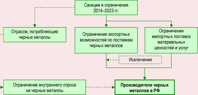 Первый тип включил санкции, которые связаны с отраслями, потребляющими черные металлы, и, по сути, косвенно влияют на внутренний спрос. Они выражаются как в запрете поставок продукции российских металлопотребляющих отраслей на внешние рынки, так и в ограничении поставок комплектующих, технологий, оборудования, что снижает производственные возможности данных отраслей.