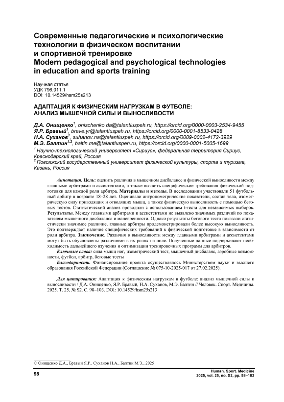 Цель: оценить различия в мышечном дисбалансе и физической выносливости между главными арбитрами и ассистентами, а также выявить специфические требования физической подготовки для каждой роли арбитра. Материалы и методы. В исследовании участвовали 51 футбольный арбитр в возрасте 18–28 лет. Оценивали антропометрические показатели, состав тела, изометрическую силу приводящих и отводящих мышц, а также физическую выносливость с помощью беговых тестов. Статистический анализ проводили с использованием t-теста для независимых выборок. Результаты. Между главными арбитрами и ассистентами не выявлено значимых различий по показателям мышечного дисбаланса и маневренности. Однако результаты бегового теста показали статистически значимое различие, главные арбитры продемонстрировали более высокую выносливость. Это подтверждает наличие специфических требований к физической подготовке в зависимости от роли арбитра. Заключение. Различия в выносливости между главными арбитрами и ассистентами могут быть обусловлены различиями в их ролях на поле. Полученные данные подчеркивают необходимость дальнейшего изучения и оптимизации тренировочных программ для арбитров.
