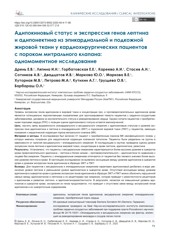 Адипокиновый статус и экспрессия генов лептина и адипонектина из эпикардиальной и подкожной жировой ткани у кардиохирургических пациентов с пороком митрального клапана: одномоментное исследование