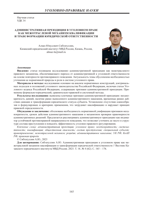 Административная преюдиция в уголовном праве как межотраслевой механизм квалификации и трансформации юридической ответственности