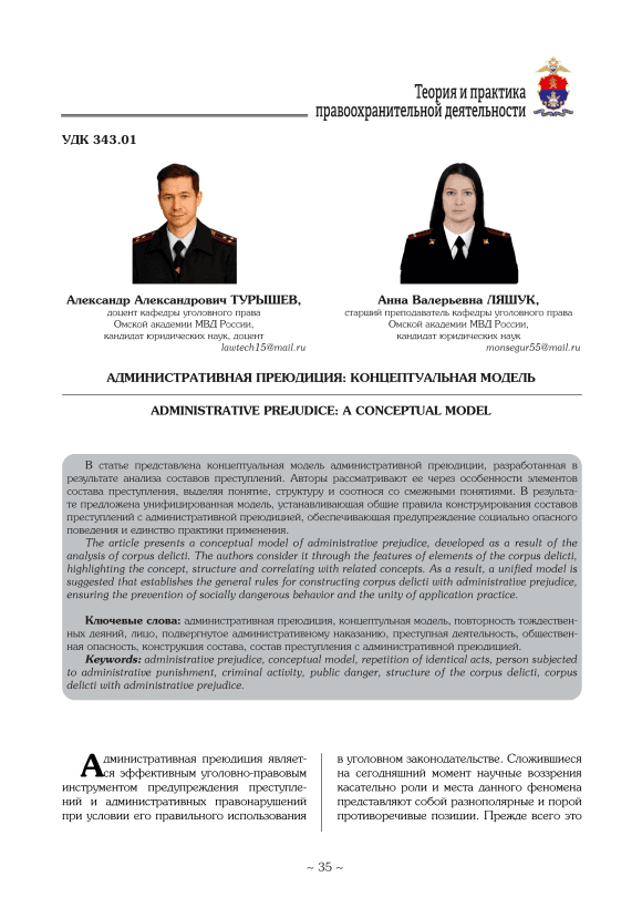В статье представлена концептуальная модель административной преюдиции, разработанная в результате анализа составов преступлений. Авторы рассматривают ее через особенности элементов состава преступления, выделяя понятие, структуру и соотнося со смежными понятиями. В результате предложена унифицированная модель, устанавливающая общие правила конструирования составов преступлений с административной преюдицией, обеспечивающая предупреждение социально опасного поведения и единство практики применения.