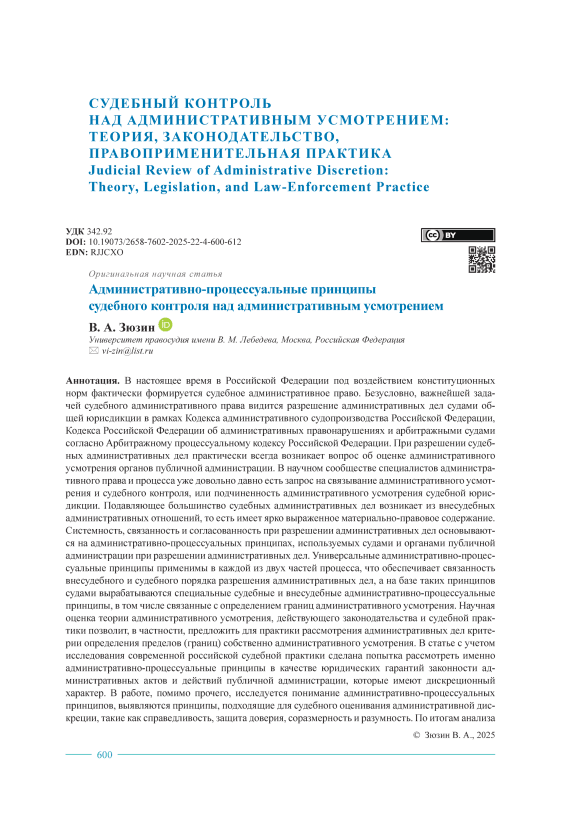 В настоящее время в Российской Федерации под воздействием конституционных норм фактически формируется судебное административное право. Безусловно, важнейшей задачей судебного административного права видится разрешение административных дел судами общей юрисдикции в рамках Кодекса административного судопроизводства Российской Федерации, Кодекса Российской Федерации об административных правонарушениях и арбитражными судами согласно Арбитражному процессуальному кодексу Российской Федерации. При разрешении судебных административных дел практически всегда возникает вопрос об оценке административного усмотрения органов публичной администрации. В научном сообществе специалистов административного права и процесса уже довольно давно есть запрос на связывание административного усмотрения и судебного контроля, или подчиненность административного усмотрения судебной юрисдикции. Подавляющее большинство судебных административных дел возникает из внесудебных административных отношений, то есть имеет ярко выраженное материально-правовое содержание. Системность, связанность и согласованность при разрешении административных дел основываются на административно-процессуальных принципах, используемых судами и органами публичной администрации при разрешении административных дел. Универсальные административно-процессуальные принципы применимы в каждой из двух частей процесса, что обеспечивает связанность внесудебного и судебного порядка разрешения административных дел, а на базе таких принципов судами вырабатываются специальные судебные и внесудебные административно-процессуальные принципы, в том числе связанные с определением границ административного усмотрения. Научная оценка теории административного усмотрения, действующего законодательства и судебной практики позволит, в частности, предложить для практики рассмотрения административных дел критерии определения пределов (границ) собственно административного усмотрения. В статье с учетом исследования современной российской судебной практики сделана попытка рассмотреть именно административно-процессуальные принципы в качестве юридических гарантий законности административных актов и действий публичной администрации, которые имеют дискреционный характер. В работе, помимо прочего, исследуется понимание административно-процессуальных принципов, выявляются принципы, подходящие для судебного оценивания административной дискреции, такие как справедливость, защита доверия, соразмерность и разумность. По итогам анализа делаются выводы о том, что применение административно-процессуальных принципов позволит не просто ограничить административное усмотрение, но требовать от публичной администрации предсказуемости и разумности правового регулирования, а также избежать формального подхода при разрешении административных дел.