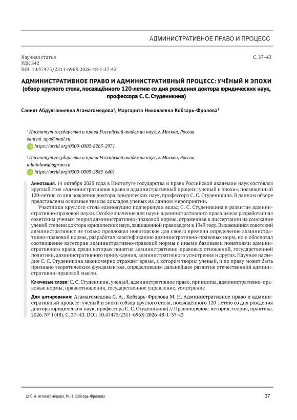 14 октября 2025 года в Институте государства и права Российской академии наук состоялся круглый стол «Административное право и административный процесс: ученый и эпохи», посвященный 120-летию со дня рождения доктора юридических наук, профессора С. С. Студеникина. В данном обзоре представлены основные тезисы докладов ученых на данном мероприятии. Участники круглого стола единодушно подчеркнули вклад С. С. Студеникина в развитие административно-правовой науки. Особое значение для науки административного права имела разработанная советским ученым теория административно-правовой нормы, отраженная в диссертации на соискание ученой степени доктора юридических наук, защищенной правоведом в 1949 году. Выдающийся советский административист не только предложил новаторское для своего времени определение административно-правовой нормы, разработал классификацию административно-правовых норм, но и обосновал соотношение категории административно-правовой нормы с иными базовыми понятиями административного права, среди которых понятия административно-правовых отношений, государственной политики, административного принуждения, административного усмотрения и других. Научное наследие С. С. Студеникина закономерно отражает время, в котором творил ученый, и по праву может быть признано теоретическим фундаментом, определившим дальнейшее развитие отечественной административно-правовой мысли.