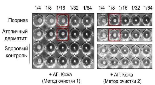 Рисунок 2. Латекс-агглютинационный тест с микросферами, покрытыми антигеном ткани человеческой кожи, выделенным методами 1 и 2. Представлено сравнение сывороток крови пациентов с хроническими аутоиммунными кожными заболеваниями — псориазом и атопическим дерматитом — с образцами здоровых доноров. Метод 1 обеспечивал более полное сохранение антигенной структуры, что подтверждается более высоким титром антител к кожному антигену, выделенному данным методом, по сравнению с методом 2