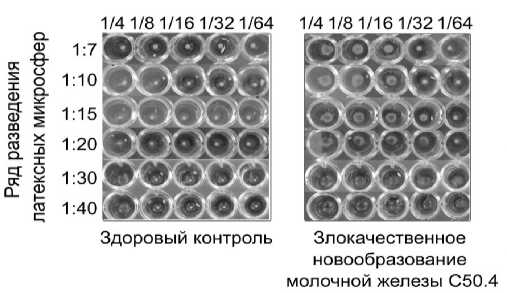 Сыворотка пациентки с раком молочной железы (МКБ-10 C50.4) демонстрировала одинаковые конечные титры агглютинации (1:32) при использовании микросфер без антигенного покрытия, а также микросфер, предварительно инкубированных с большинством тканевых экстрактов, сывороткой крови или раствором БСА. В то же время, микросферы, покрытые кожным антигеном, обеспечивали более низкий титр агглютинации (1:8), что позволяет предположить частичное экранирование реакционно-способных участков поверхности латекса за счёт нанесённого слоя кожного антигена и, как следствие, формирование специфического, зависящего от кожного антигена, взаимодействия.