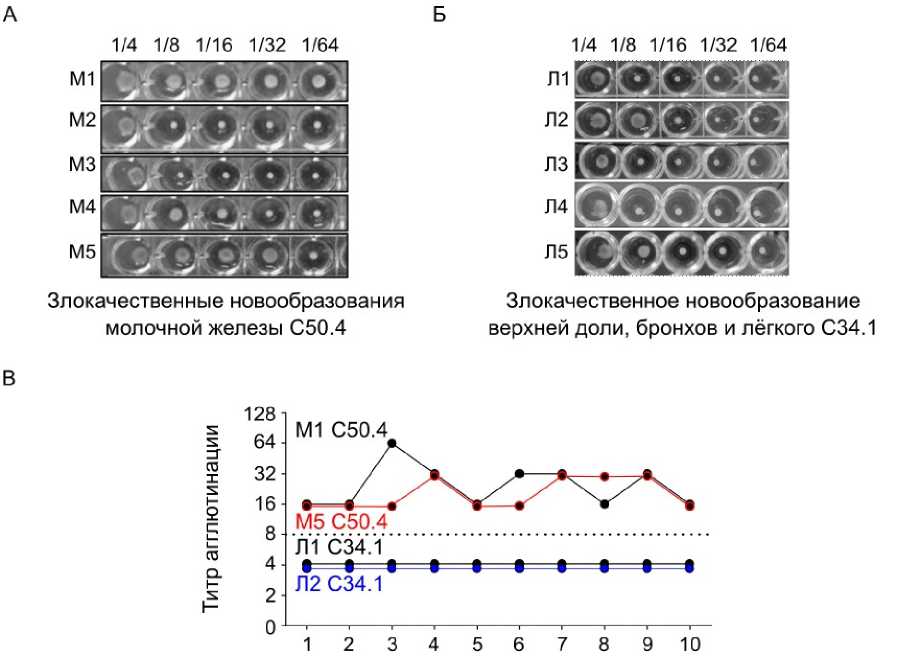 Рисунок 4. ЛАТ-анализ сывороток пациентов с раком молочной железы. (А) Ряд разведений сыворотки крови пациенток М1-5 с диагнозом рак молочной железы (C50.4) от 1:4 до 1:64 в присутствии латексных микросфер; повышение титров выше 1:8 соответствует аутоиммунной реакции. (Б) Для сравнения показана сыворотка крови пациента с иммунологически «холодной» опухолью (C34.1) без повышения титров ЛАТ. (В) Динамика иммунного профиля пациентов с HER2-положительной, гормон-рецептор-негативной (HR–) карциномой (М1, М5) и злокачественным новообразованием верхней доли, бронхов и лёгкого (Л1, Л2) в течение 10 месяцев противоопухолевого лечения
