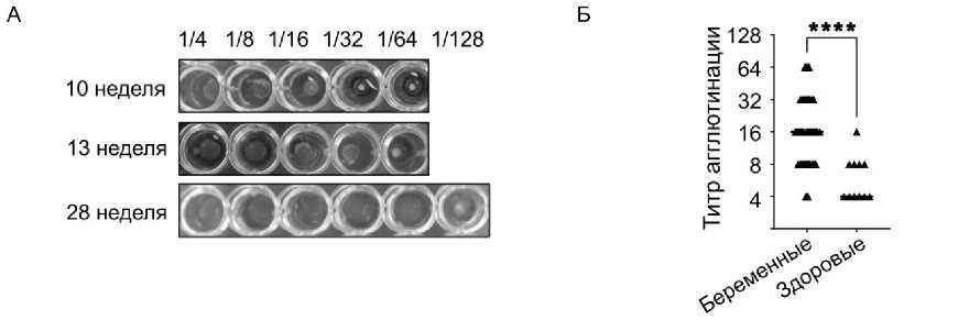 Рисунок 5. Латекс-агглютинационный тест для определения иммунной активности у беременных женщин. (А) Представлен пример реакций агглютинации латексных микросфер с сыворотками крови беременной пациентки P19, демонстрирующие повышенные титры (1:16–1:64) в течение 10, 13, 28 недели беременности по сравнению с (Б) здоровыми и небеременными женщинами, что отражает физиологическую системную активацию гуморального иммунитета в период беременности (лонгнормальный двусторонний непарный t-тест, **** = Р < 0.0001)