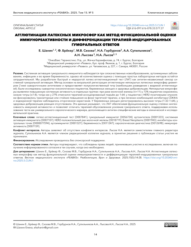 Системная активация гуморального иммунитета наблюдается при злокачественных новообразованиях, аутоиммунных заболеваниях, инфекциях и во время беременности, однако её количественная оценка с помощью простых лабораторных методов остаётся затруднительной. Мы разработали быстрый и недорогой латекс-агглютинационный тест (ЛАТ) как антиген-независимый сенсор системной гуморальной активации. Метод основан на визуальной регистрации агглютинации непокрытых латексных микросфер диаметром 2 мкм сывороточными антителами и предоставляет полуколичественный титр (наибольшее разведение с видимой агглютинацией). Были исследованы сыворотки онкологических пациентов, беременных женщин и здоровых добровольцев. Непокрытые микросферы выявляли повышенную системную активность в отдельных группах: при раке молочной железы (n=11) у 73% пациентов сохранялись низкие титры (≤1:8), тогда как у 27% отмечался терапией-ассоциированный подъём до 1:64; у пациентов с HER2-позитивными опухолями фиксировались транзиторные или стойкие повышения на фоне таргетной терапии, а при лечении комбинацией ингибитора CDK4/6 и эндокринной терапии наблюдалось отсроченное нарастание. У беременных женщин регистрировались высокие титры (1:32–1:64), у здоровых добровольцев реакция отсутствовала. Эти данные указывают, что ЛАТ обеспечивая функциональную оценку степени «интенсивность иммунной активности» и позволяет отличать терапией-обусловленное усиление гуморального ответа, поддерживая использование теста как универсального серологического маркера, дополняющего антиген-специфические методы в клинической и исследовательской практике.