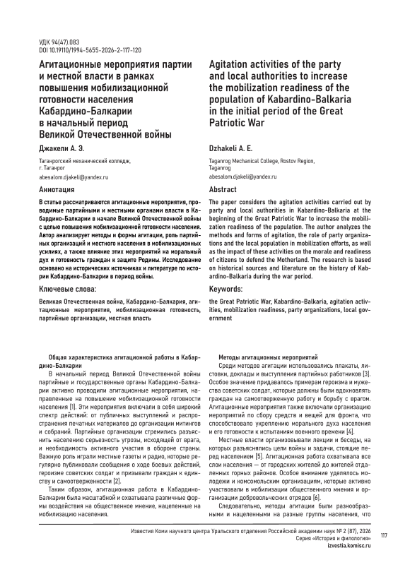 The paper considers the agitation activities carried out by party and local authorities in Kabardino-Balkaria at the beginning of the Great Patriotic War to increase the mobilization readiness of the population. The author analyzes the methods and forms of agitation, the role of party organizations and the local population in mobilization efforts, as well as the impact of these activities on the morale and readiness of citizens to defend the Motherland. The research is based on historical sources and literature on the history of Kabardino- Balkaria during the war period.