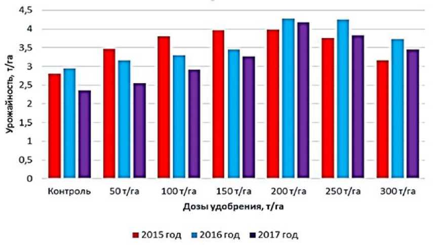 Fig. 1. The yield of spring wheat under the action and aftereffect of liquid organic fertilizer based on pig manure in meadow-chernozem soil in the conditions of the south of Western Siberia (2015–2017)