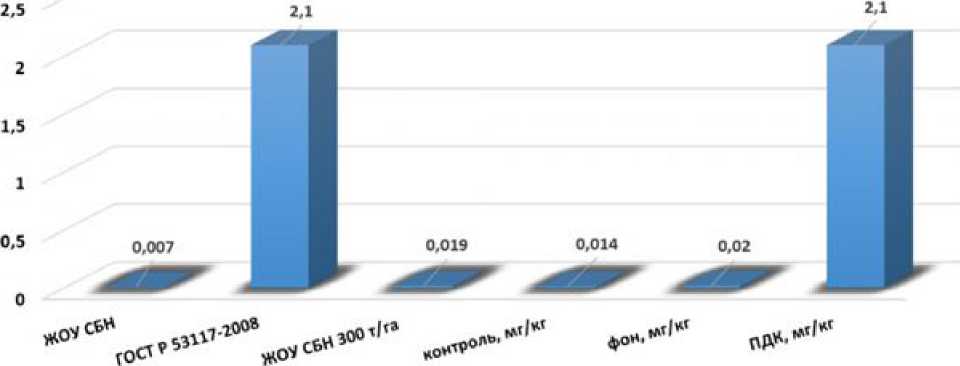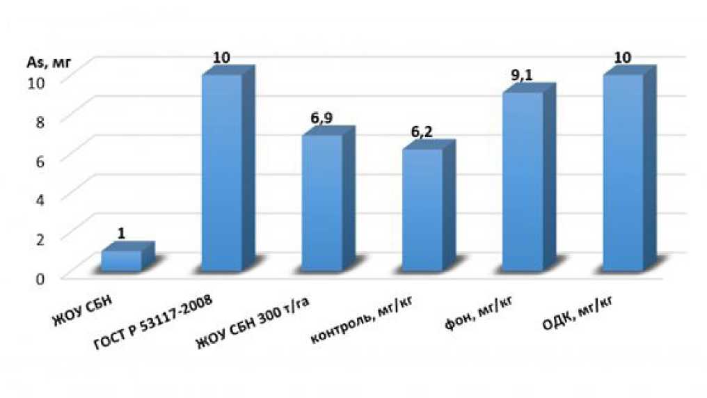 Установлено, что валовое содержание As в почве было максимальным при дозе внесения ЖОУ СБН 300 т/га (6.9 мг/кг). При этом в контрольном варианте содержание As составляло 6.2 мг/кг. Оба значения не превышают фонового для региона (10.0 мг/ кг) и ОДК для нейтральных суглинистых и глинистых почв (10.0 мг/кг), но превышают величину ПДК (2.0 мг/кг). В аналогичных условиях содержание Hg на контроле составляло