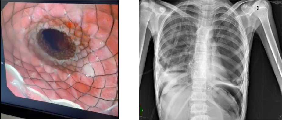 В раннем послеоперационном периоде течение заболевания осложнилось развитием перфорации пищевода. Возникновение данного осложнения было обусловлено сочетанием тяжёлого исходного состояния пациента, выраженной дилатации и истончения стенки пищевода, а также наличием рубцовых изменений дистального отдела на фоне длительного течения ахалазии. Перфорация пищевода привела к распространению инфекционновоспалительного процесса за пределы органа и развитию тяжёлых системных осложнений. На фоне перфорации пищевода у пациента сформировалась эмпиема плевры, сопровождавшаяся нарастанием дыхательной недостаточности и признаками интоксикации (Рисунок 2). Инфекционный процесс быстро приобрёл генерализованный характер, что привело к развитию тяжёлого септического шока, сопровождавшегося выраженными гемодинамическими нарушениями и прогрессирующей полиорганной недостаточностью.
