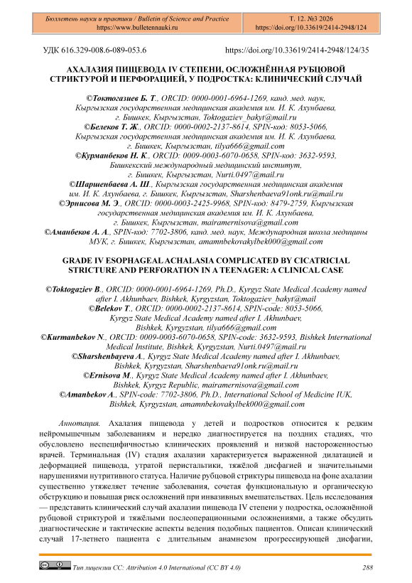 Ахалазия пищевода у детей и подростков относится к редким нейромышечным заболеваниям и нередко диагностируется на поздних стадиях, что обусловлено неспецифичностью клинических проявлений и низкой настороженностью врачей. Терминальная (IV) стадия ахалазии характеризуется выраженной дилатацией и деформацией пищевода, утратой перистальтики, тяжёлой дисфагией и значительными нарушениями нутритивного статуса. Наличие рубцовой стриктуры пищевода на фоне ахалазии существенно утяжеляет течение заболевания, сочетая функциональную и органическую обструкцию и повышая риск осложнений при инвазивных вмешательствах. Цель исследования — представить клинический случай ахалазии пищевода IV степени у подростка, осложнённой рубцовой стриктурой и тяжёлыми послеоперационными осложнениями, а также обсудить диагностические и тактические аспекты ведения подобных пациентов. Описан клинический случай 17-летнего пациента с длительным анамнезом прогрессирующей дисфагии, выраженной нутритивной недостаточностью и абсолютной непроходимостью пищевода. Диагноз установлен на основании клинических данных и результатов лучевых методов исследования. Лечение проводилось поэтапно и включало кардиомиотомию по Геллеру, эндоскопическое бужирование рубцовой стриктуры и последующее стентирование пищевода. Несмотря на этапный подход к лечению, в раннем послеоперационном периоде развилась перфорация пищевода, осложнившаяся эмпиемой плевры, септическим шоком и полиорганной недостаточностью. Пациенту потребовалось интенсивное лечение в условиях реанимации с применением антибактериальной терапии, дренирования плевральной полости и респираторной поддержки. Представленный клинический случай демонстрирует высокие риски инвазивных вмешательств у подростков с терминальной стадией ахалазии пищевода и выраженной нутритивной недостаточностью. Ранняя диагностика заболевания и своевременное направление пациентов в специализированные центры имеют ключевое значение для предотвращения тяжёлых осложнений и улучшения исходов лечения.
