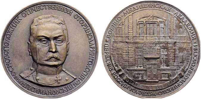Рис. 4. Медаль 1991 г. Военно-медицинская академия. Первая в России кафедра оториноларингологии. Н.П. Симановский.