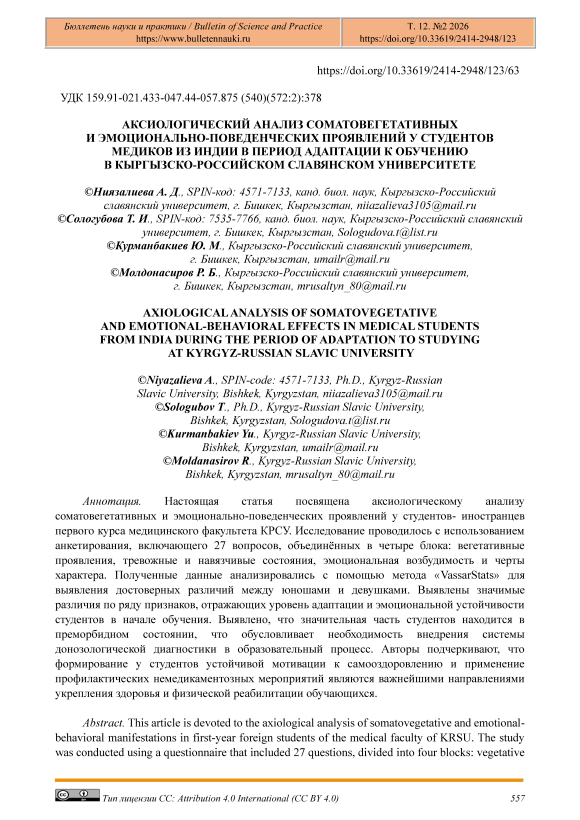 Аксиологический анализ соматовегетативных и эмоционально-поведенческих проявлений у студентов медиков из Индии в период адаптации к обучению в Кыргызско-Российском славянском университете