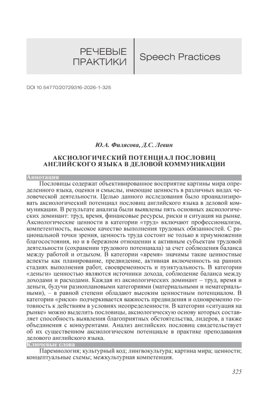 Пословицы содержат объективированное восприятие картины мира определенного языка, оценки и смыслы, имеющие ценность в различных видах человеческой деятельности. Целью данного исследования было проанализировать аксиологический потенциал пословиц английского языка в деловой коммуникации. В результате анализа были выявлены пять основных аксиологических доминант: труд, время, финансовые ресурсы, риски и ситуация на рынке. Аксиологические ценности в категории «труд» включают профессионализм, компетентность, высокое качество выполнения трудовых обязанностей. С рациональной точки зрения, ценность труда состоит не только в приумножении благосостояния, но и в бережном отношении к активным субъектам трудовой деятельности (сохранении трудового потенциала) за счет соблюдения баланса между работой и отдыхом. В категории «время» значимы такие ценностные аспекты как планирование, предвидение, активная включенность на ранних стадиях выполнения работ, своевременность и пунктуальность. В категории «деньги» ценностью являются источники дохода, соблюдение баланса между доходами и расходами. Каждая из аксиологических доминант – труд, время и деньги, будучи разноплановыми категориями (материальными и нематериальными), – в равной степени обладают высоким ценностным потенциалом. В категории «риски» подчеркивается важность предвидения и одновременно готовность к действиям в условиях неопределенности. В категории «ситуация на рынке» можно выделить пословицы, аксиологическую основу которых составляет способность выявления благоприятных обстоятельства, лидеров, а также объединения с конкурентами. Анализ английских пословиц свидетельствует об их существенном аксиологическом потенциале в практике преподавания делового английского языка.
