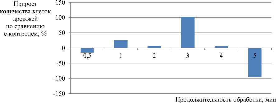 Рис. 2. Влияние продолжительности предварительной обработки засевных дрожжей ультразвуком на прирост количества клеток по окончании культивирования на модельной питательной среде Fig. 2. Effect of duration of preliminary treatment of seed yeast with ultrasound on the increase in cell titer at the end of cultivation on a model nutrient medium