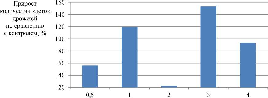 Ряд показателей устанавливали только по окончании культивирования дрожжевых популяций. На рис. 2 представлены результаты определения количества дрожжевых клеток после 4 сут выращивания популяции на модельной питательной среде.