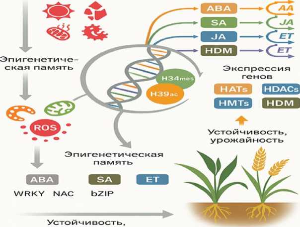 Схематическое представление роли активных форм кислорода (ROS) в формировании эпигенетической памяти и стрессоустойчивости злаков. ROS, взаимодействуя с гормональными и эпигенетическими регуляторами (HATs, HDACs, HMTs, HDMs), модулируют экспрессию генов, обеспечивающих адаптацию и повышение урожайности