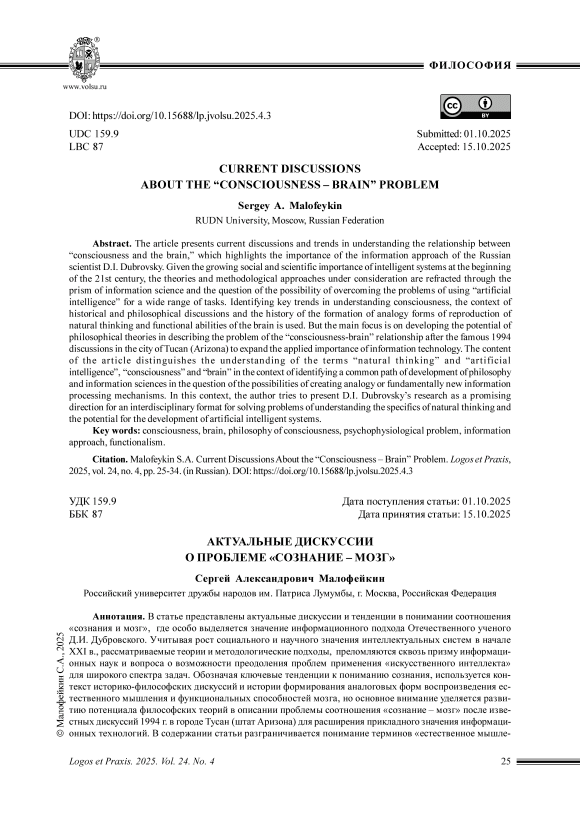 В статье представлены актуальные дискуссии и тенденции в понимании соотношения «сознания и мозг», где особо выделяется значение информационного подхода Отечественного ученого Д.И. Дубровского. Учитывая рост социального и научного значения интеллектуальных систем в начале XXI в., рассматриваемые теории и методологические подходы, преломляются сквозь призму информационных наук и вопроса о возможности преодоления проблем применения «искусственного интеллекта» для широкого спектра задач. Обозначая ключевые тенденции к пониманию сознания, используется контекст историко-философских дискуссий и истории формирования аналоговых форм воспроизведения естественного мышления и функциональных способностей мозга, но основное внимание уделяется развитию потенциала философских теорий в описании проблемы соотношения «сознание – мозг» после известных дискуссий 1994 г. в городе Тусан (штат Аризона) для расширения прикладного значения информационных технологий. В содержании статьи разграничивается понимание терминов «естественное мышление» и «искусственный интеллект», «сознание» и «мозг» в контексте выявления общего пути развития философии и информационных наук в вопросе о возможностях создания аналоговых или принципиально новых механизмов обработки информации. В данном контексте автор пытается представить исследования Д.И. Дубровского в качестве перспективного направления для междисциплинарного формата решения задач понимания специфики естественного мышления и потенциала развития искусственных интеллектуальных систем.