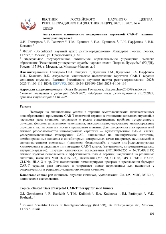 Несмотря на значительные успехи в терапии гематологических злокачественных новообразований, применение CAR-T клеточной терапии в отношении солидных опухолей, в частности рака яичников, сопряжено с рядом существенных проблем: гетерогенность опухоли, феномен антигенного ускользания, высокоиммуносупрессивное микроокружение опухоли и частая резистентность к препаратам платины. Для преодоления этих препятствий активно разрабатываются инновационные стратегии — мультитаргетные CAR-T клетки, усовершенствованные конструкции CAR, нацеленные на специфические антигены, комбинированные подходы с ингибиторами контрольных точек (например, цемиплимаб) и антиангиогенными средствами (например, бевацизумаб), а также лимфодеплетирующая химиотерапия и различные пути введения CAR-T клеток (внутривенно, интраперитонеально, внутриплеврально). Текущие клинические исследования (NCT07067255 – NCT04981119) активно изучают безопасность и эффективность CAR-T терапии, нацеленной на различные антигены, такие как MUC16 (CA-125), мезотелин (MSLN), CD146, GPC3, FSHR, B7-H3, CLDN6, HLA-G и др. Эти исследования демонстрируют прогресс в преодолении барьеров CAR-T терапии рака яичников и открывают новые перспективы для пациентов с рефрактерными и рецидивирующими опухолями яичников.