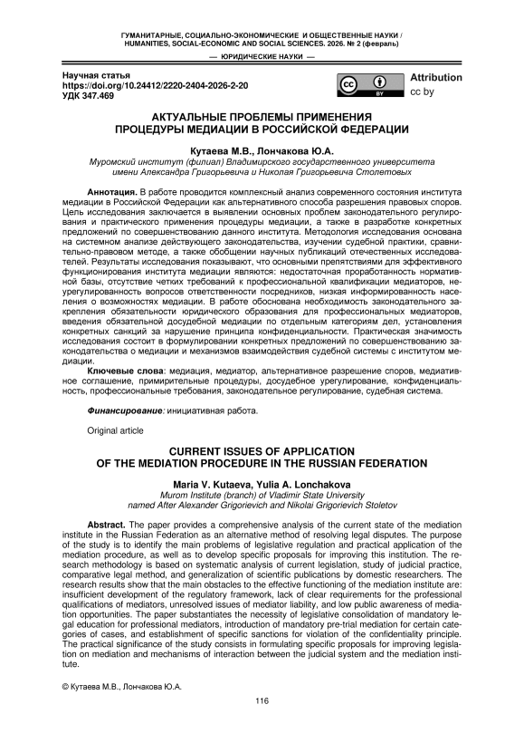 The paper provides a comprehensive analysis of the current state of the mediation institute in the Russian Federation as an alternative method of resolving legal disputes. The purpose of the study is to identify the main problems of legislative regulation and practical application of the mediation procedure, as well as to develop specific proposals for improving this institution. The research methodology is based on systematic analysis of current legislation, study of judicial practice, comparative legal method, and generalization of scientific publications by domestic researchers. The research results show that the main obstacles to the effective functioning of the mediation institute are: insufficient development of the regulatory framework, lack of clear requirements for the professional qualifications of mediators, unresolved issues of mediator liability, and low public awareness of mediation opportunities. The paper substantiates the necessity of legislative consolidation of mandatory legal education for professional mediators, introduction of mandatory pre-trial mediation for certain categories of cases, and establishment of specific sanctions for violation of the confidentiality principle. The practical significance of the study consists in formulating specific proposals for improving legislation on mediation and mechanisms of interaction between the judicial system and the mediation institute.
