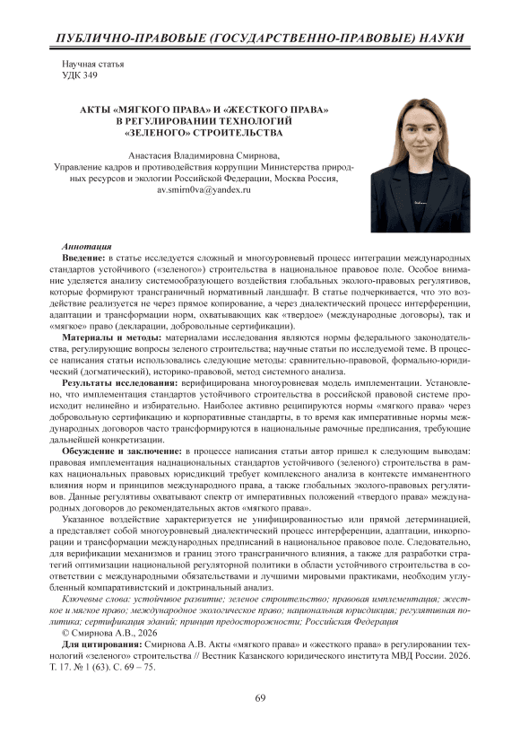 Введение: в статье исследуется сложный и многоуровневый процесс интеграции международных стандартов устойчивого («зеленого») строительства в национальное правовое поле. Особое внимание уделяется анализу системообразующего воздействия глобальных эколого-правовых регулятивов, которые формируют трансграничный нормативный ландшафт. В статье подчеркивается, что это воздействие реализуется не через прямое копирование, а через диалектический процесс интерференции, адаптации и трансформации норм, охватывающих как «твердое» (международные договоры), так и «мягкое» право (декларации, добровольные сертификации). Материалы и методы: материалами исследования являются нормы федерального законодательства, регулирующие вопросы зеленого строительства; научные статьи по исследуемой теме. В процессе написания статьи использовались следующие методы: сравнительно-правовой, формально-юридический (догматический), историко-правовой, метод системного анализа. Результаты исследования: верифицирована многоуровневая модель имплементации. Установлено, что имплементация стандартов устойчивого строительства в российской правовой системе происходит нелинейно и избирательно. Наиболее активно реципируются нормы «мягкого права» через добровольную сертификацию и корпоративные стандарты, в то время как императивные нормы международных договоров часто трансформируются в национальные рамочные предписания, требующие дальнейшей конкретизации. Обсуждение и заключение: в процессе написания статьи автор пришел к следующим выводам: правовая имплементация наднациональных стандартов устойчивого (зеленого) строительства в рамках национальных правовых юрисдикций требует комплексного анализа в контексте имманентного влияния норм и принципов международного права, а также глобальных эколого-правовых регулятивов. Данные регулятивы охватывают спектр от императивных положений «твердого права» международных договоров до рекомендательных актов «мягкого права». Указанное воздействие характеризуется не унифицированностью или прямой детерминацией, а представляет собой многоуровневый диалектический процесс интерференции, адаптации, инкорпорации и трансформации международных предписаний в национальное правовое поле. Следовательно, для верификации механизмов и границ этого трансграничного влияния, а также для разработки стратегий оптимизации национальной регуляторной политики в области устойчивого строительства в соответствии с международными обязательствами и лучшими мировыми практиками, необходим углубленный компаративистский и доктринальный анализ.