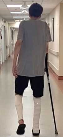 Основные задачи: контроль отека, обучение навыкам самостоятельного передвижения с использованием костылей (включая ходьбу по лестнице и пандусам), начальное увеличение объема движений и мышечной силы в мышцах бедра, голени и туловища. Иммобилизацию осуществляли, используя ортез на голеностопном суставе, с полным исключением осевой нагрузки на оперированную конечность для обеспечения условий спокойного заживления послеоперационной раны первичным натяжением (рис. 2). Профилактика и лечение отеков включали возвышенное положение конечности, в ряде случаев — аппликации с раствором диметилсульфоксида (димексид). Проводили обучение ходьбе на костылях без опоры, изометрические упражнения для мышц нижней конечности, активную лечебную физкультуру (ЛФК) в тазобедренном и коленном суставах.