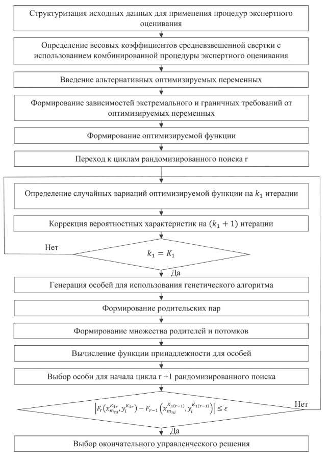На основе решения задачи оптимизации (2) редуцированное множество вариантов сокращается до ограниченного множества доминирующих вариантов, что на третьем этапе позволяет группе экспертов принять окончательное управленческое решение, используя голосование и принцип большинства. Таким образом, интеграция исходной информации и экспертных оценок позволяет сформировать оптимизационную модель (2), позволяющую построить комбинированную схему поиска и на ее основе алгоритмическую процедуру принятия управленческого решения.