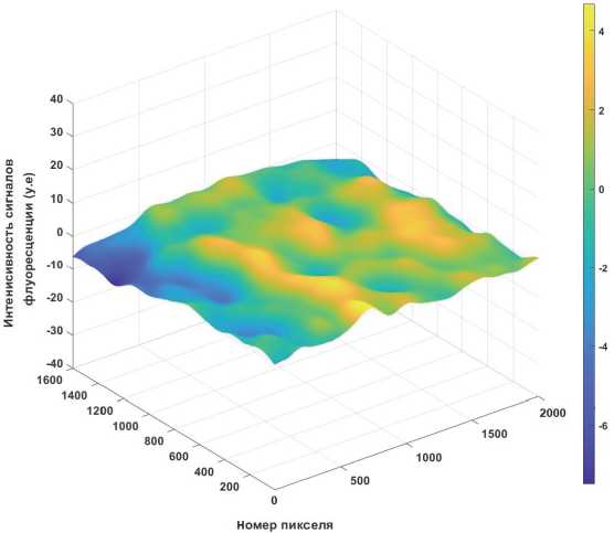 При использовании перспективных методов коррекции перед началом эксперимента необходимо заранее получить изображение фоновой составляющей. В ходе выполнения настоящей работы такие априорные изображения фоновой поверхности были получены. Способ получения заключался в том, что в реакционную ячейку, в которую обычно вводится рабочая проба, было введено специальное люминесцирующее вещество – радомин. Время экспозиции было подобрано таким образом, чтобы сигнал флуоресценции мог быть зарегистрирован в каждом канале. Полученные изображения сглаживались с помощью фильтра Гаусса. Затем проводилось суммирование изображений каждого поля зрения и находилось среднее изображение. Такое среднее изображение являлось априорным изображением фоновой поверхности.