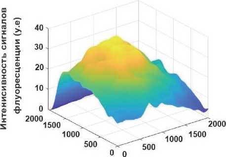 На рис. 2 а показан результат обработки изображения, представленного на рис. 1. Изображение, показанное на рис. 1, было обработано с помощью морфологической операции эрозии со структурным элементом disk с радиусом 20 пикселей, а затем сглажено с помощью фильтра Гаусса со средним квадратичным отклонением (сигма), равным 55 пикселей. На рис. 2 б показано трехмерное изображение после обработки исходного изображения с помощью следующих процедур. Морфологическая обработка и сглаживание с помощью фильтра нижних частот позволили выделить из исходного изображения фоновую составляющую.