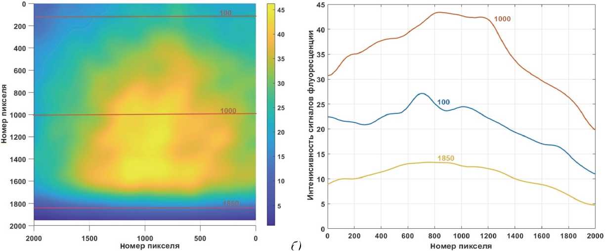 Рис. 3. (а) Результат обработки изображения, представленного на рис. 1, (б) профили обработанных сигналов