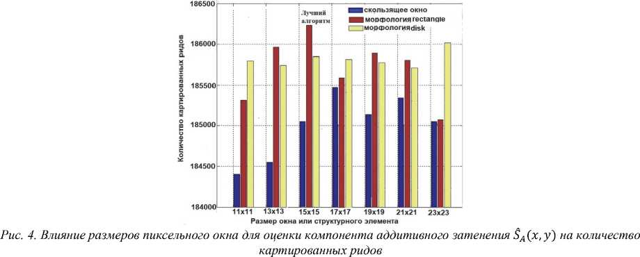 На рис. 4 приведены результаты выявления количества фрагментов нуклеиновых кислот (картированных ридов), которое было выбрано программой, осуществляющей сборку целого генома из отдельных его частей исследования в зависимости от размеров пиксельного окна для оценки компонента аддитивного затенения SA(x,у), а также от применяемого алгоритма. Кроме алгоритма со скользящим окном, применялись морфологические алгоритмы, реализующие операции эрозии и дилатации со структурными элементами rectangle и disk разных размеров: 11×11, 13×13, 15×15, 17×17, 19×19, 21×21 и 23×23.