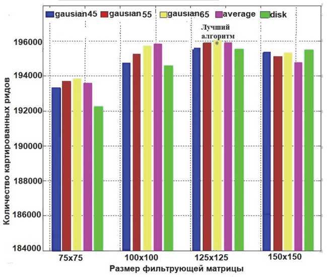 На рисунке показано, что наибольшее количество картированных ридов при коррекции аддитивной составляющей затемнения имеет алгоритм, реализующий морфологическую обработку со структурным элементом rectangle размером 15×15. Для этого алгоритма количество картированных ридов оказалось равным 186249. Для алгоритма со скользящим окном наилучший результат оказался для окна 17×17, который составил 185477. Анализ чисел, стоящих на горизонтальной оси рисунка, показывает, что все рассмотренные алгоритмы дают близкие результаты, отличающиеся друг от друга примерно 1 %.