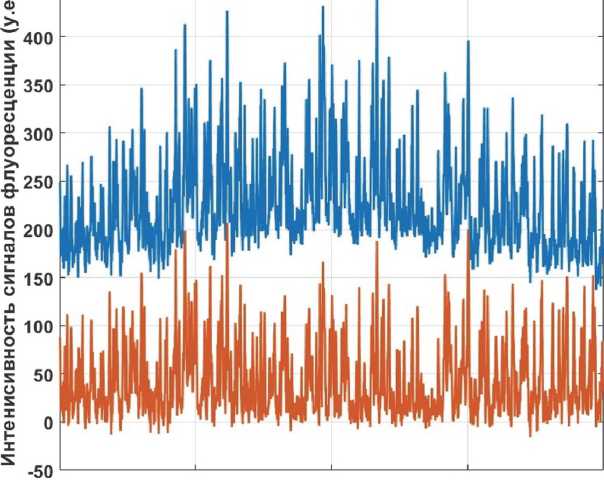 Рис. 6. Графики профилей 1000 строки изображения для исходного файла (верхний график) и для файла после корректировки неравномерности освещения (нижний график) по горизонтальной оси номер пикселя. По вертикальной оси интенсивность флуоресценции в условных единицах