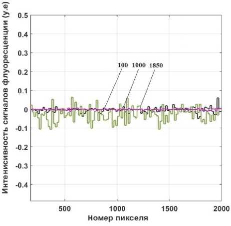На рис. 7 показаны профили строк с номерами: 100, 1000 и 1850 для откорректированного изображения после того, как к нему были применены те же процедуры обработки, аналогичные показанным на рис. 3 б . Профили строк изображения близки к прямым линиям. Средние значения профилей строк 10, 1000 и 1850 близки к нулю и равны соответственно 0,005; 0,001 и 0,03, а их средние квадратичные отклонения равны 0,01; 0,004 и 0,04. Профиль самой тусклой линии соответствует строке 1850, находится внизу рисунка и немного отличается от прямой линии.