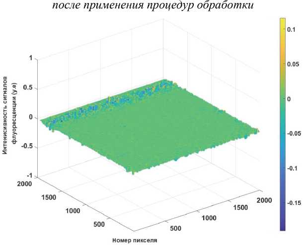 На рис. 8 показано трехмерное представление результата обработки изображения, откорректированного на влияние неравномерного освещения. Трехмерное представление имеет форму, близкую к плоскости, и eе среднее значение близко к нулю и равно 0,04. Это обстоятельство свидетельствует о том, что в откорректированном на влияние неравномерного освещения изображении удален фон.