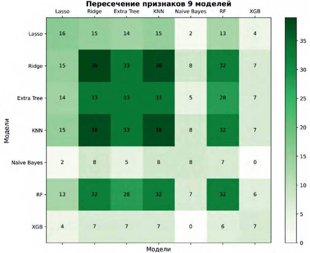 Признаков, которые бы встречались во всех моделях одновременно, выявлено не было. Большинство схожих переменных были выбраны алгоритмами Ridge, ET, KNN, и RF. Пол, возраст, генотипы CYP1A2 *1A/*1C и CYP2С19 *1/*2, аллели *5 CYP2D6 и *17 CYP2С19 встречались в шести из семи моделей (86%).