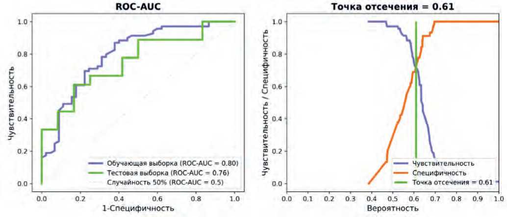 На четвертом этапе построенные модели были протестированы на обучающей и тестовой выборках. Для каждой модели рассчитаны точность, чувствительность, специфичность и ROC-AUC (ROC – Receiver Operating Characteristic, рабочая характеристика приемника; AUC Area Under the Curve, площадь под кривой) с определением 95% доверительного интервала (ДИ) методом Бутстреп (Bootstrap) при выборке 1000 экземпляров [13]. Также для максимизации чувствительности и специфичности полученной модели было рассчитано пороговое значение (точка отсечения или cut off) для определения наличия / отсутствия изучаемого исхода. Для оценки калибровки модели использована оценка Брайера (Brier).