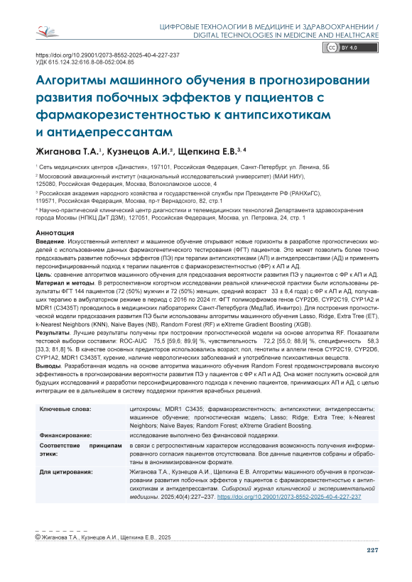 Введение. Искусственный интеллект и машинное обучение открывают новые горизонты в разработке прогностических моделей с использованием данных фармакогенетического тестирования (ФГТ) пациентов. Это может позволить более точно предсказывать развитие побочных эффектов (ПЭ) при терапии антипсихотиками (АП) и антидепрессантами (АД) и применять персонифицированный подход к терапии пациентов с фармакорезистентностью (ФР) к АП и АД. Цель: сравнение алгоритмов машинного обучения для предсказания вероятности развития ПЭ у пациентов с ФР к АП и АД. Материал и методы. В ретроспективном когортном исследовании реальной клинической практики были использованы результаты ФГТ 144 пациентов (72 (50%) мужчин и 72 (50%) женщин, средний возраст 33 ± 8,4 года) с ФР к АП и АД, получавших терапию в амбулаторном режиме в период с 2016 по 2024 гг. ФГТ полиморфизмов генов CYP2D6, CYP2C19, CYP1A2 и MDR1 (C3435T) проводилось в медицинских лабораториях Санкт-Петербурга (МедЛаб, Инвитро). Для построения прогностической модели предсказания развития ПЭ были использованы алгоритмы машинного обучения Lasso, Ridge, Extra Tree (ET), k-Nearest Neighbors (KNN), Naive Bayes (NB), Random Forest (RF) и eXtreme Gradient Boosting (XGB). Результаты. Лучшие результаты получены при построении прогностической модели на основе алгоритма RF. Показатели тестовой выборки составили: ROC-AUC 75,5 [59,6; 89,9] %, чувствительность 72,2 [55,0; 88,9] %, специфичность 58,3 [33,3; 81,8] %. В качестве основных предикторов использовались возраст, пол, генотипы и аллели генов CYP2C19, CYP2D6, CYP1A2, MDR1 С3435Т, курение, наличие неврологических заболеваний и употребление психоактивных веществ. Выводы. Разработанная модель на основе алгоритма машинного обучения Random Forest продемонстрировала высокую эффективность в прогнозировании вероятности развития ПЭ у пациентов с ФР к АП и АД. Она может послужить основой для будущих исследований и разработки персонифицированного подхода к лечению пациентов, принимающих АП и АД, с целью интеграции ее в дальнейшем в систему поддержки принятия врачебных решений.